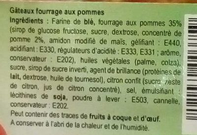 Farine de blé 50 %, fourrage aux pommes 35 %, huiles végétales de palme 7.5 %, huiles végétales de colza 3.75 %, sucre 1.875 %, sirop de sucre inverti 0.9375 %, agent de brillance 0.46875 %, citron confit 0.234375 %, sel 0.1171875 %, émulsifiant 0.05859375 %, poudre à lever 0.029296875 %, cannelle 0.0146484375 %, conservateur 0.0146484375 %